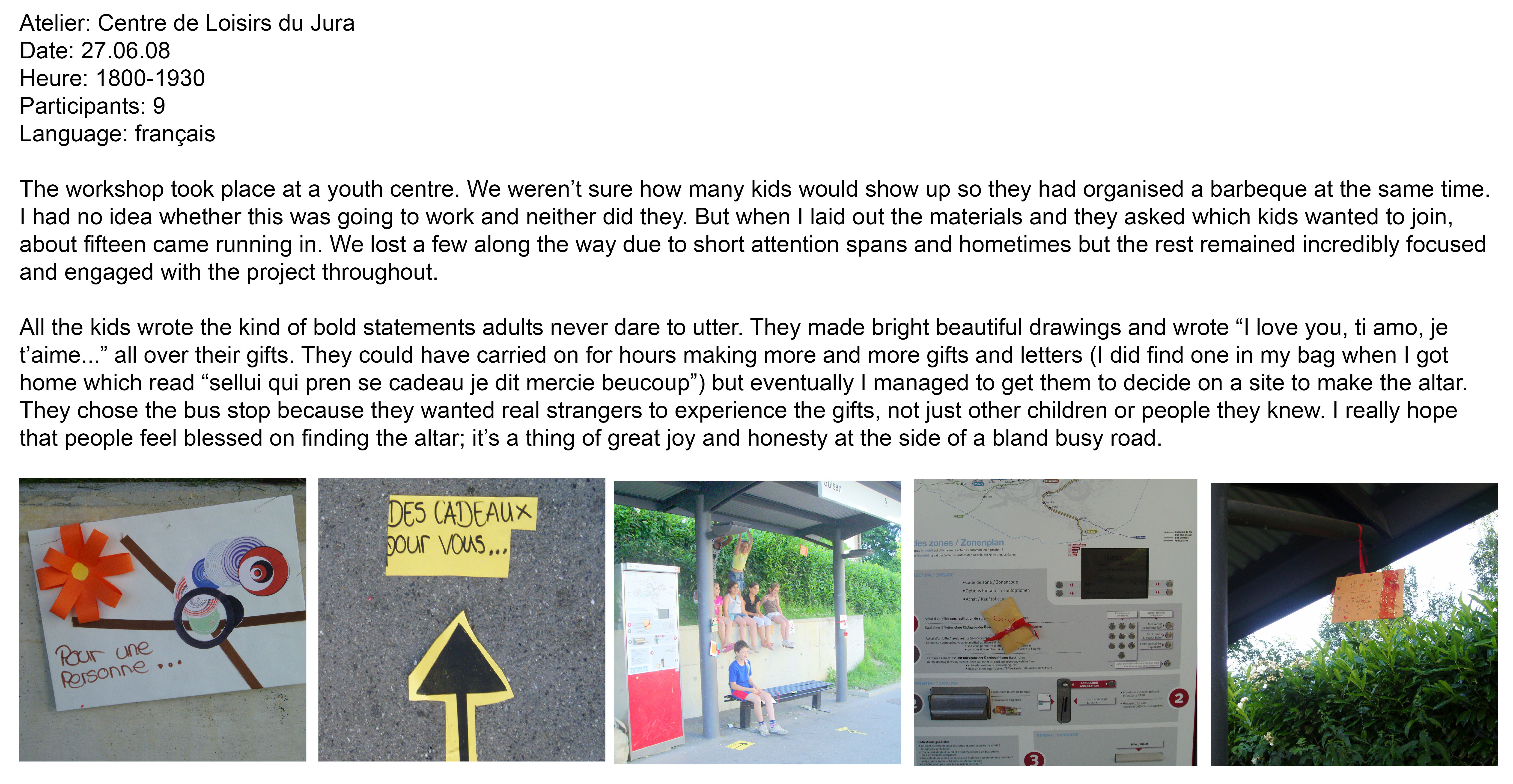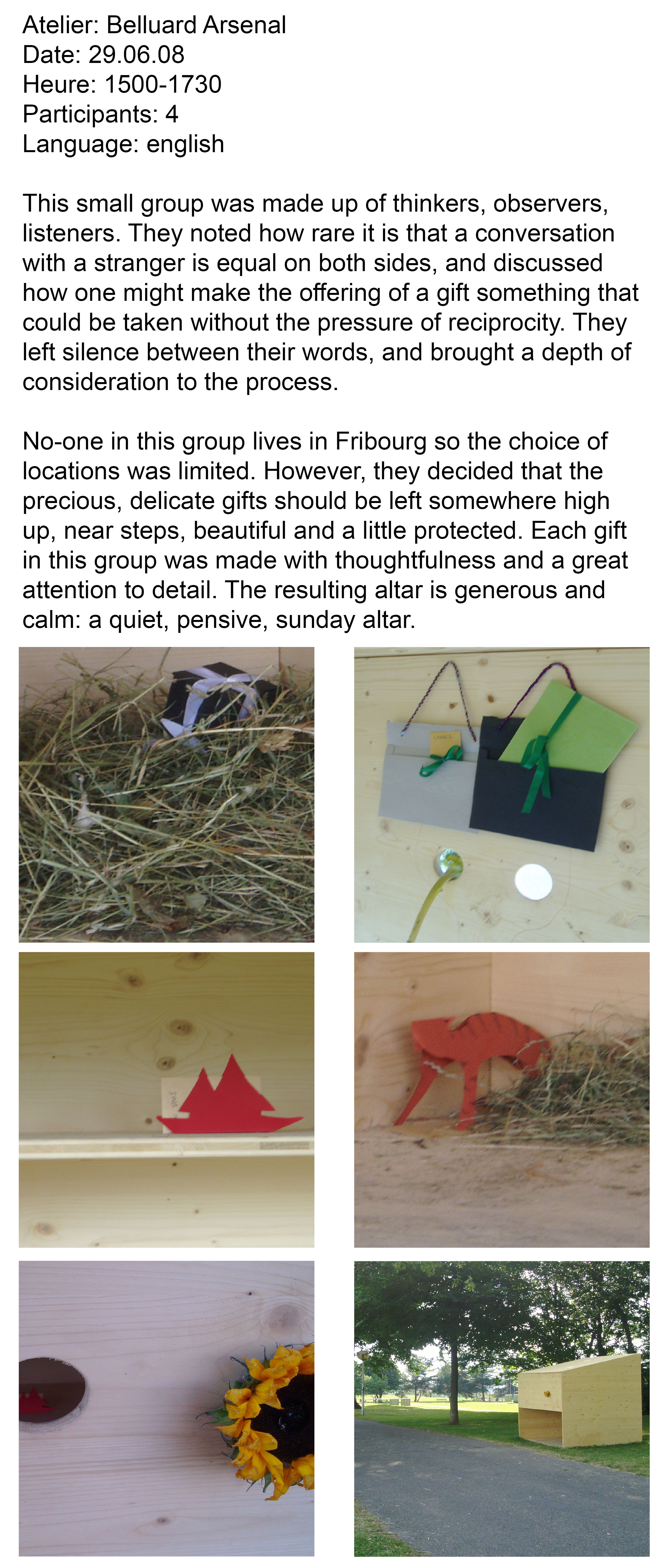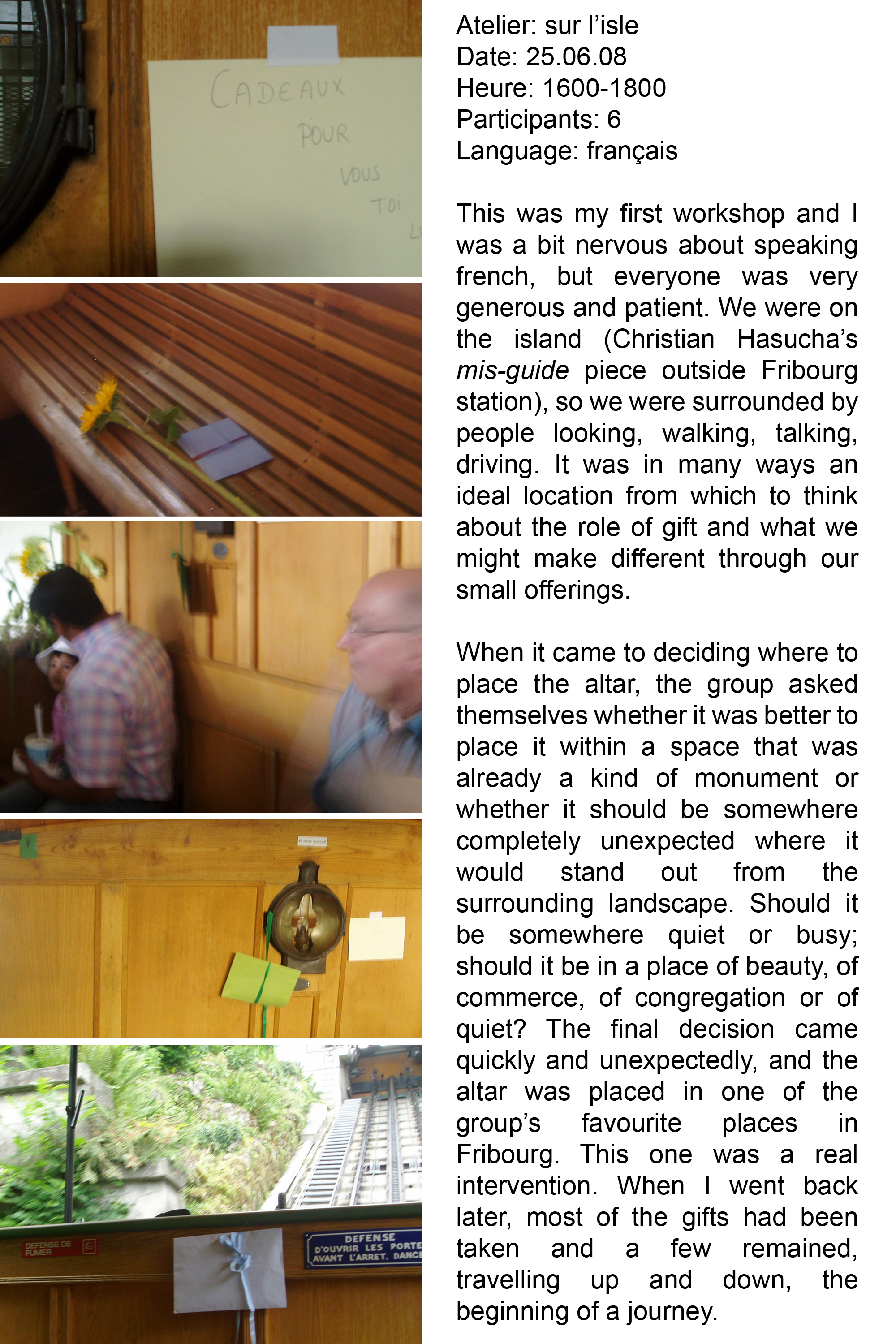 Continuing research begun in her series, small gifts, Rajni ran a series of creative workshops as part of the Belluard Bollwerk International festival inviting members of the public to make letters and gifts to be left at a series of altars in the town. Alluding to the Catholic history of Fribourg, Rajni then worked with each workshop group to create a series of altars in public spaces chosen by the group. Like the lighting of a candle at an altar, but with the aim of guiding prayers across the earth to another person, this project encourages us to think about the connections we might have with strangers and the role that gifting and exchange can take in modern society. Part of UK-based group Wrights and Sites 'mis-guides' series.