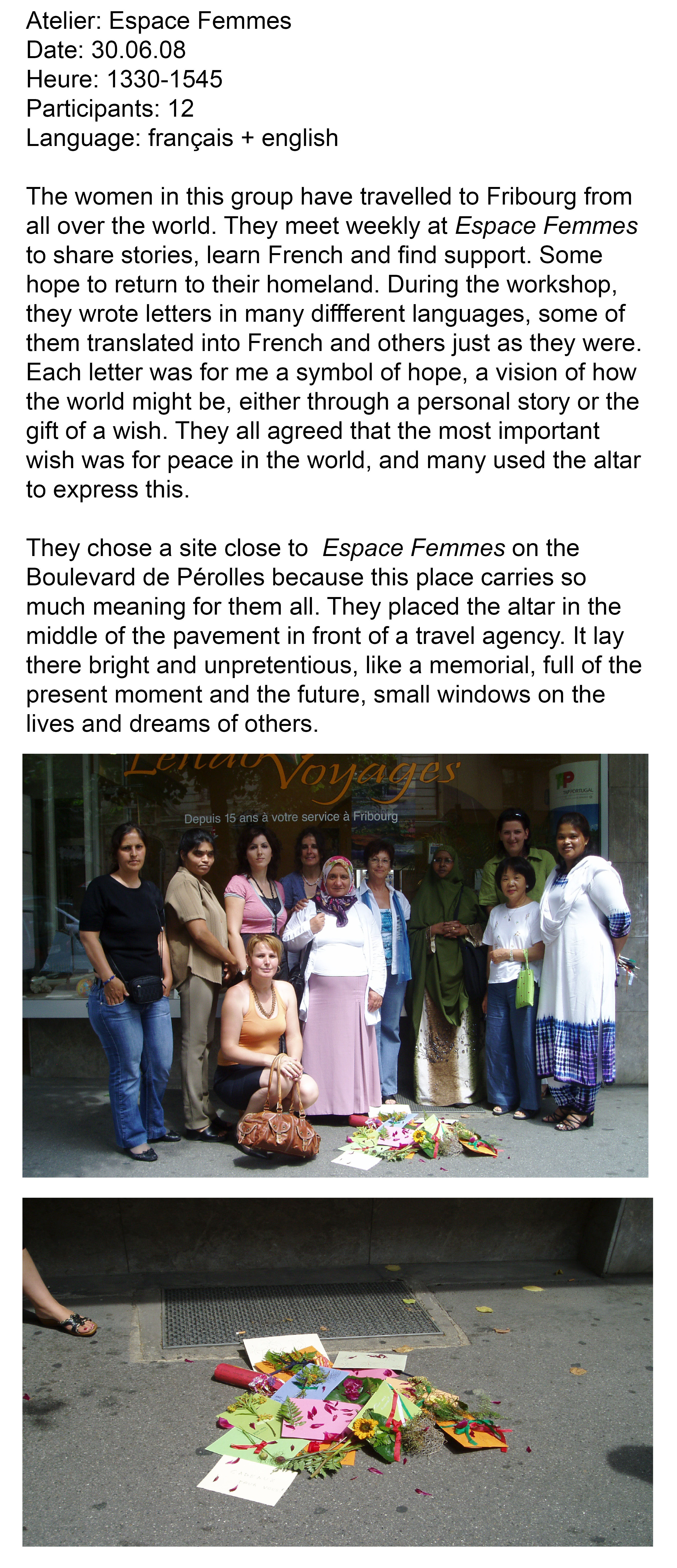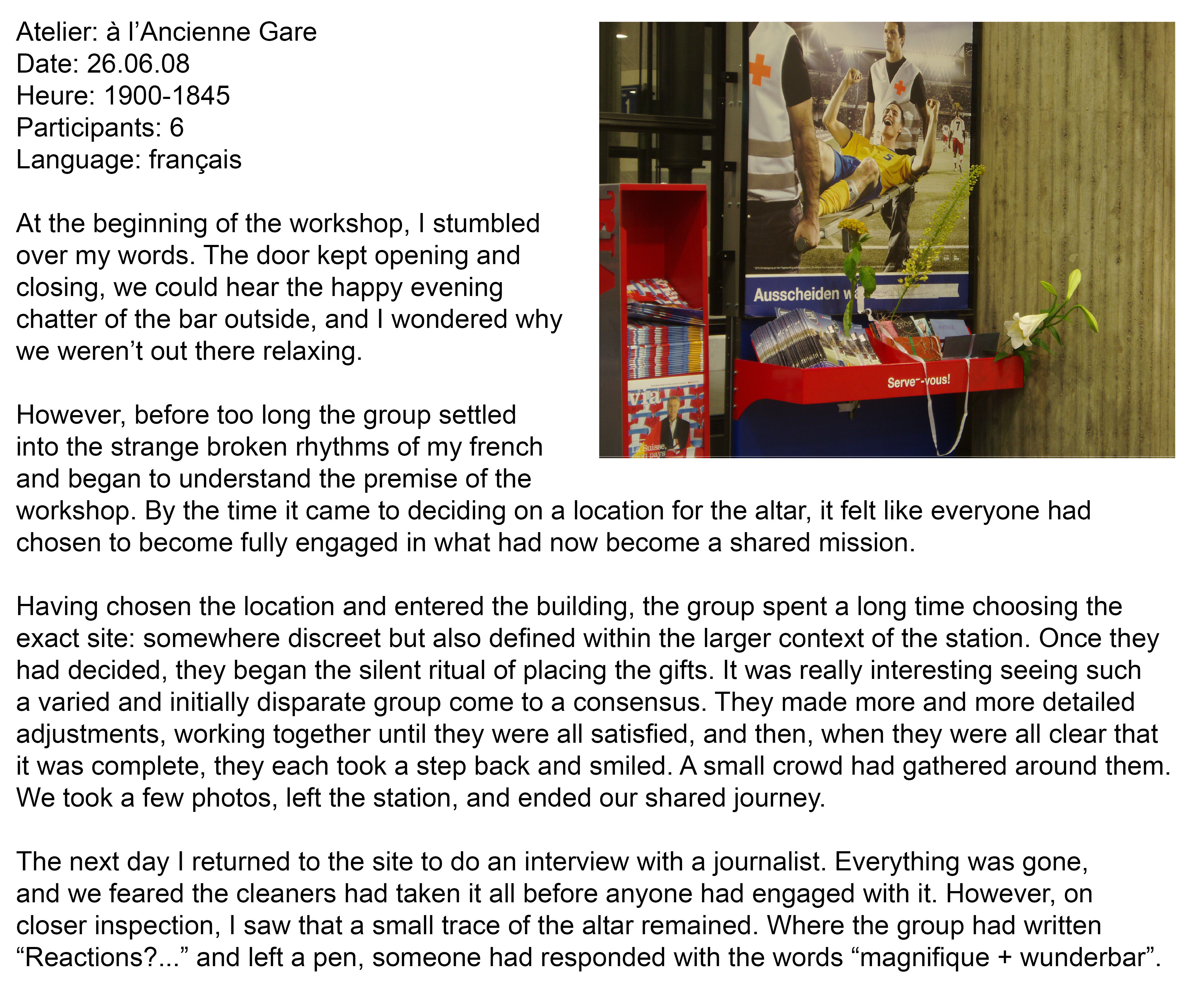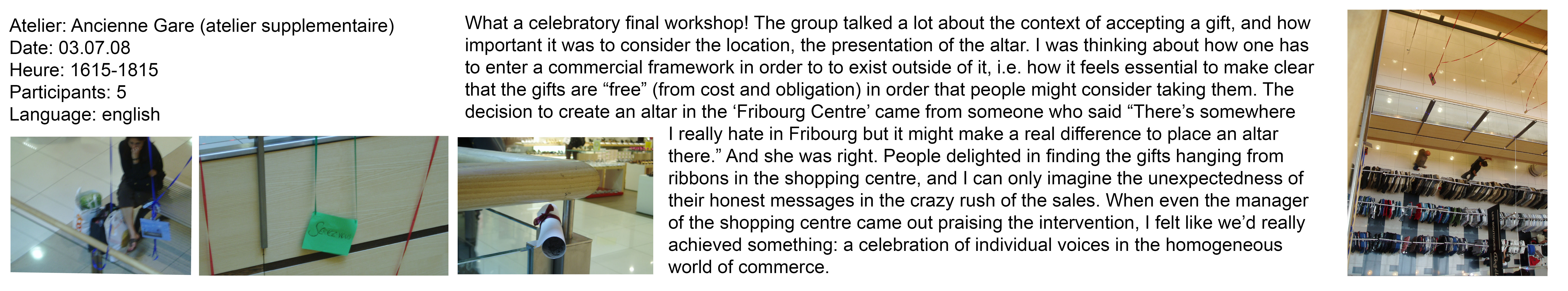 Continuing research begun in her series, small gifts, Rajni ran a series of creative workshops as part of the Belluard Bollwerk International festival inviting members of the public to make letters and gifts to be left at a series of altars in the town. Alluding to the Catholic history of Fribourg, Rajni then worked with each workshop group to create a series of altars in public spaces chosen by the group. Like the lighting of a candle at an altar, but with the aim of guiding prayers across the earth to another person, this project encourages us to think about the connections we might have with strangers and the role that gifting and exchange can take in modern society. Part of UK-based group Wrights and Sites 'mis-guides' series.