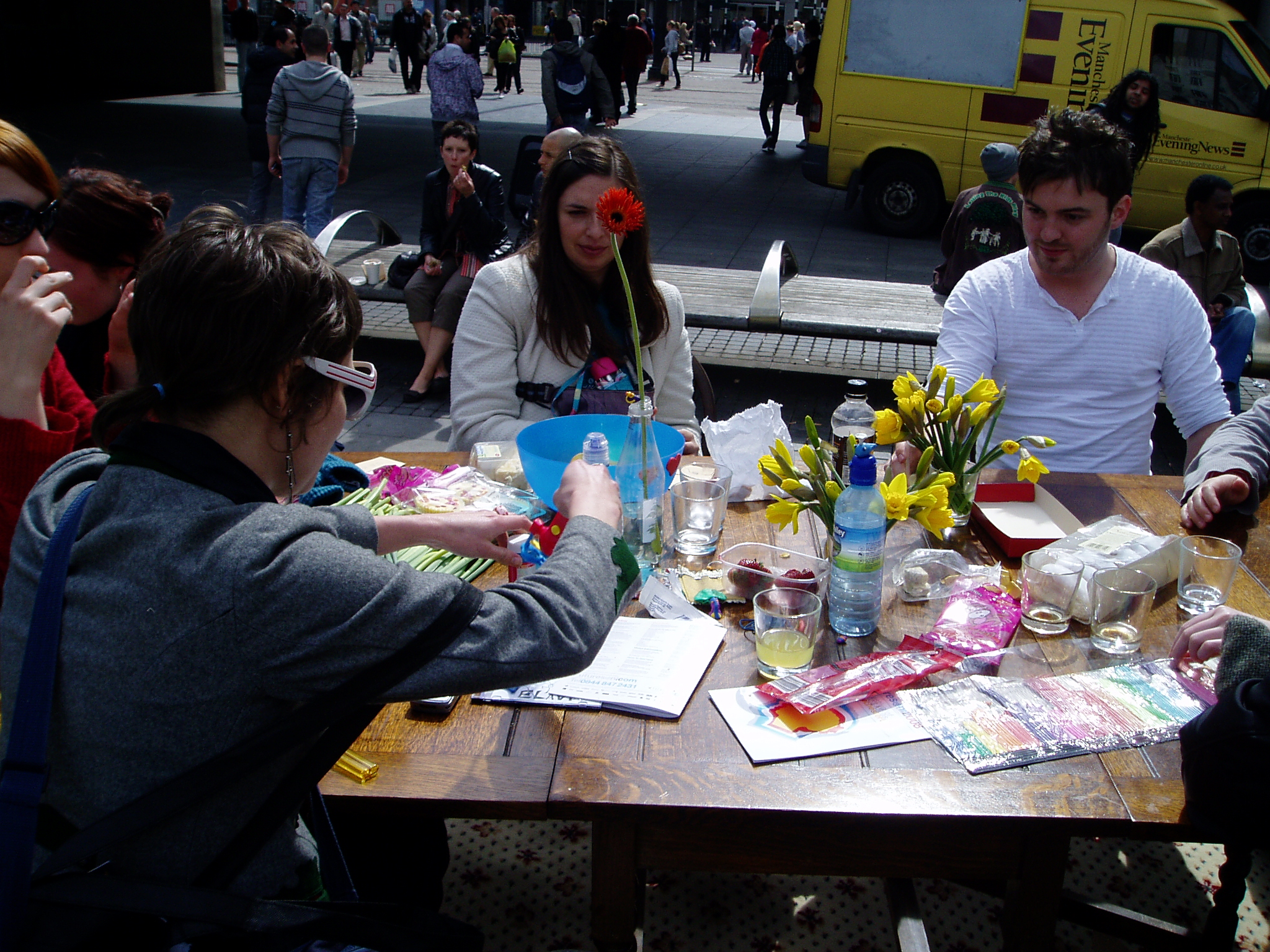 Drawing on Rajni's research projects into gift-giving as intervention in public space, this interactive performance is designed to take place in busy communal areas. Passers-by are greeted by a large dinner table, where various other members of the public may be seated at any time. Newcomers are invited to take part by accepting a gift, entering into a relationship with the gathering for as long or as short a time as they choose.